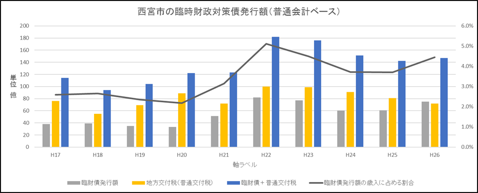 2点目の質問です。臨財債は発行額でなく、国が定めた発行可能額をもとに、交付税算定されるため、満額発行する必要はありません。H26年度はアサヒビール西宮工場跡地取得のような事業もあり、満額発行となりました。しかし、H24.25年度は満額発行していません。今後も、大型の事業が想定されない年度であれば、H24.25年度のように発行額の抑制が可能ではないでしょうか。