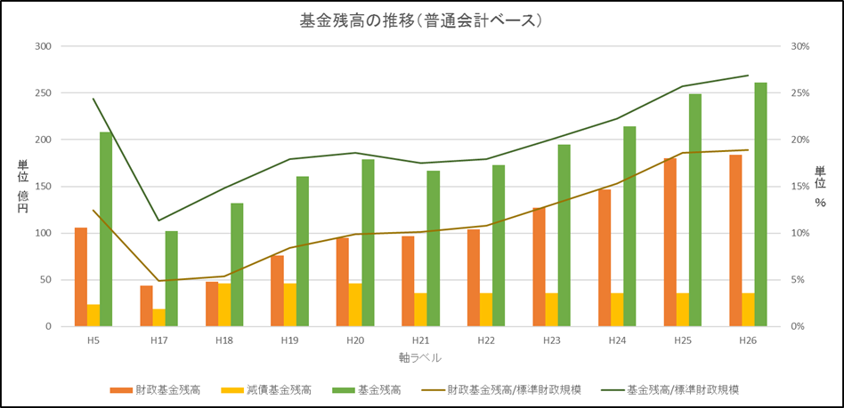 普通会計ベースで作成された決算カードによると、財政基金、減債基金、特定目的基金を合計した基金残高は