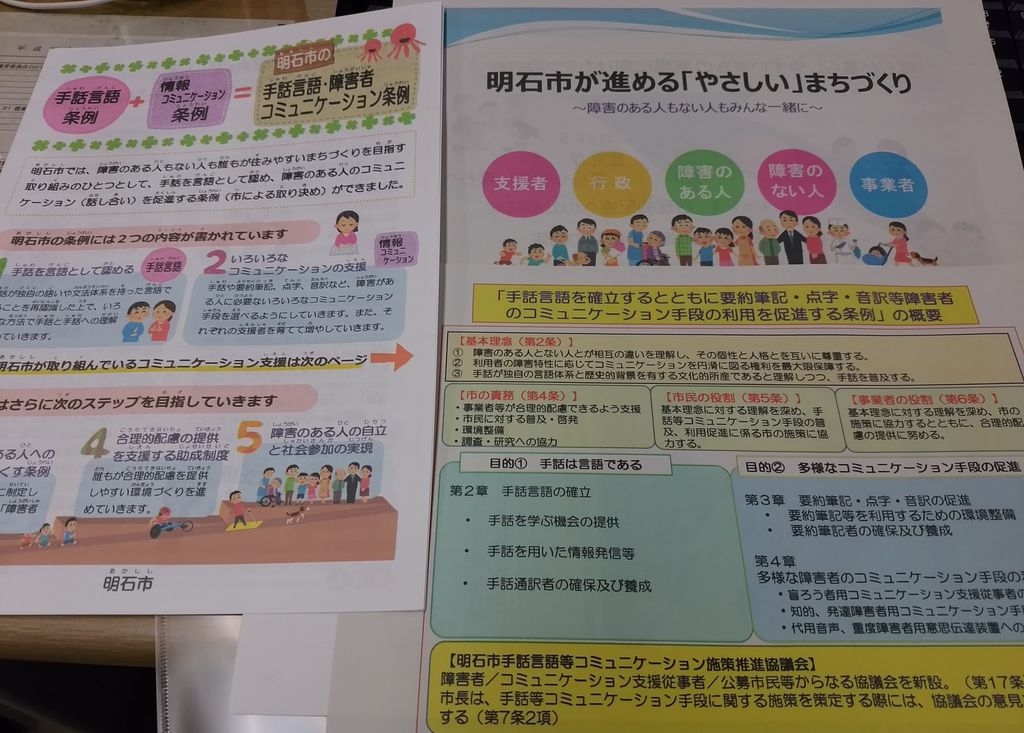 2017年6月30日現在、101の自治体で条例が制定されています。その内、手話以外のコミュニケーション手段を条例と対象としている自治体は9つです。明石市の正式な条例の名称「手話言語を確立するとともに要約筆記・点字・音訳等障害者のコミュニケーション手段の利用を促進する条例」という通り、文字の表示、点字、音声、触覚など他のコミュニケーション手段も対象としています。