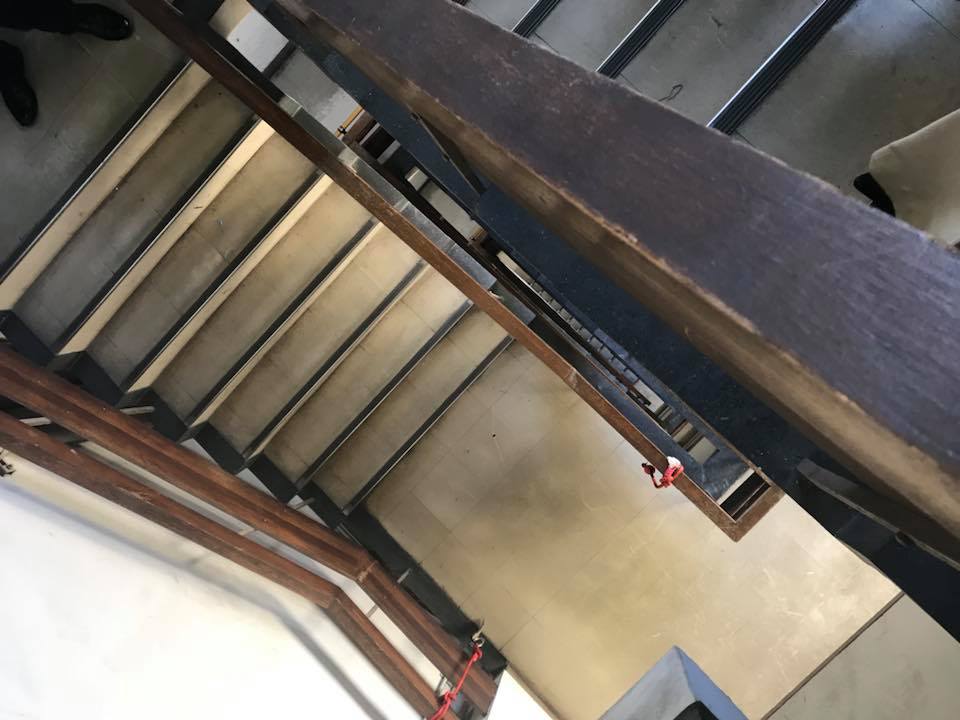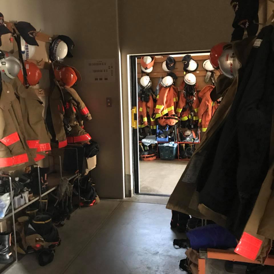 現在、国道2号に面している消防署ですが、築51年を経過し、雨漏りをはじめとする老朽化や狭あい化に加えて、耐震性能にも課題があります。以前、視察した時の画像です。階段がゆがんでいる、出動の際の着替えスペースが狭い、地下はひと昔前を連想させる状態でした。