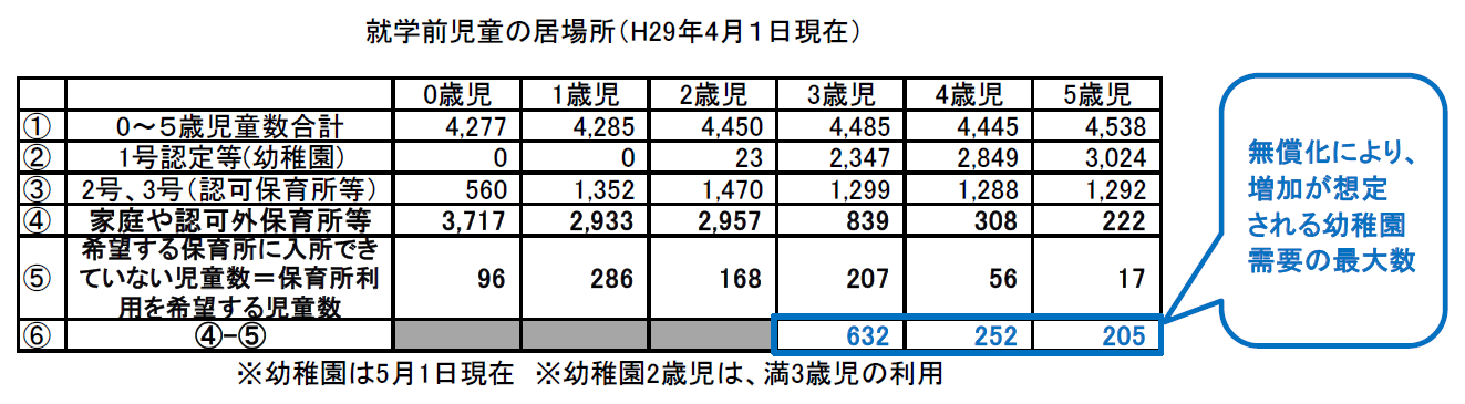 今年度4月時点の数値をもとに最大で幼稚園需要がどれくらい増加するかを試算しました。家庭で育てられている3歳児、4歳児、5歳児の数から、希望する保育所に入所できなかった利用保留児童数、つまり保育所を利用したい児童数を引くと3歳児632人、4歳児252人、5歳児205人。これだけの幼稚園需要が増えることが考えられます。