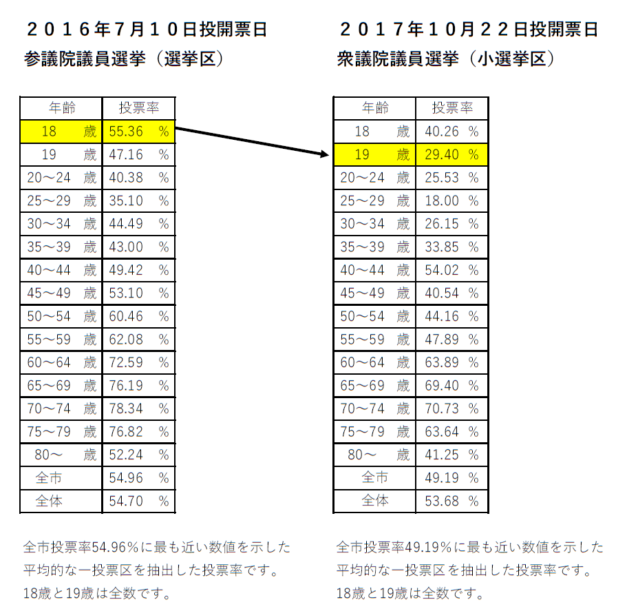 見方はいろいろあるでしょうが、一番気になるのが、参議院選挙の時の18歳が翌年19歳になって、こんなにも投票率が下がるのかということです。この原因についていくつか思うところがありますが、改めて整理してみたいと思います。