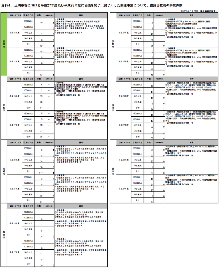他市との比較資料によると西宮市では、平成27、28年度共に標準協議期間を大きく超えて半数以上が協議に150日以上かかっています。他市との比較において、対象や手続きの流れが違うことを前提としても、150日以上かかっている事業が多いことがわかります。その中には、通常であれば4月スタートである学校園や児童福祉施設もあります。
